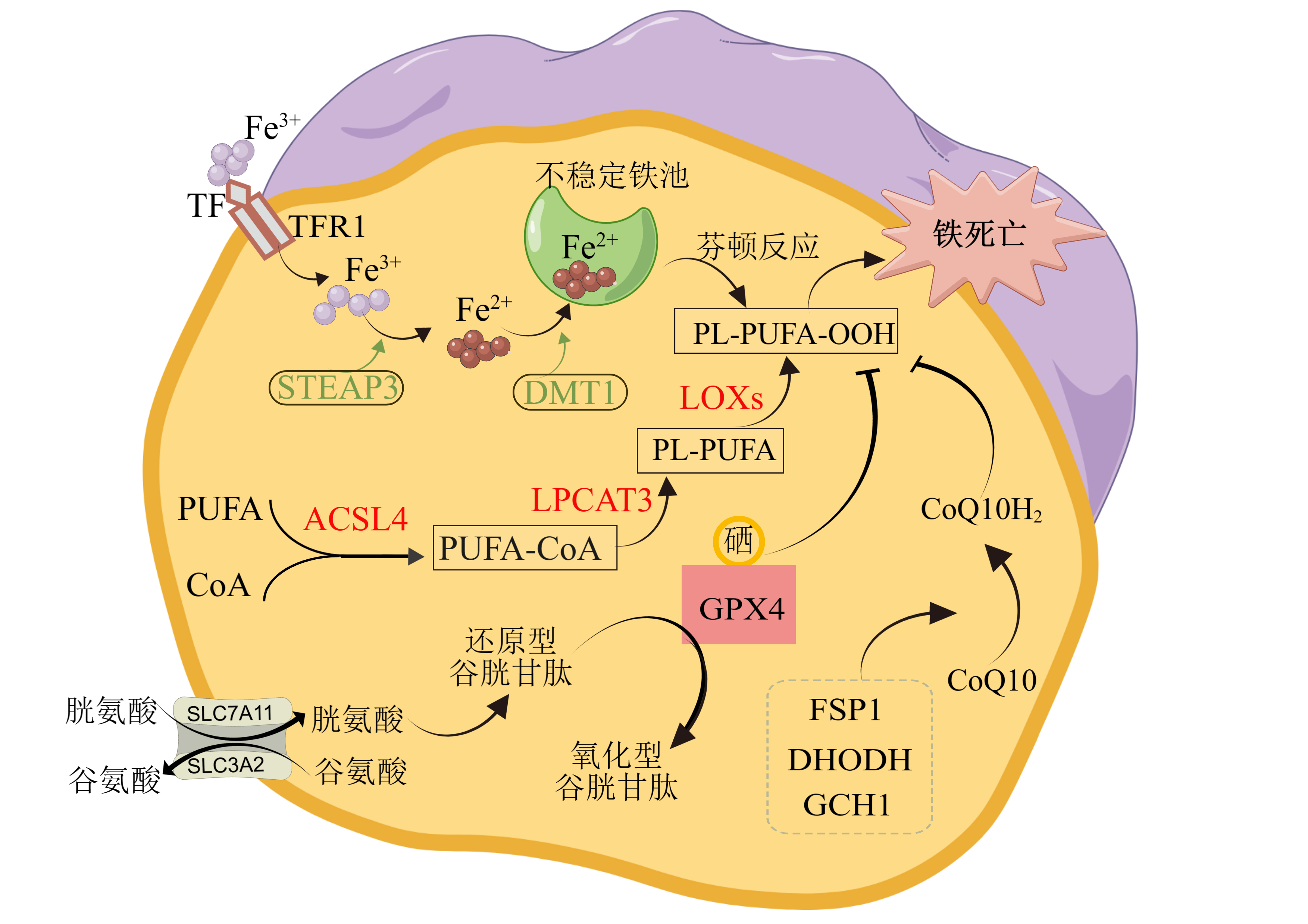 图2 靶向铁死亡的肾脏病治疗制剂的作用机制 注:A:铁死亡与AKI;B:铁死亡与DN;C:铁死亡与RIF;D:铁死亡与CIN;NRF2:核因子E2相关因子2;Rev?erb?α/β:核受体家族成员;SLC7A11:溶质载体家族7成员11;GPX4:谷胱甘肽过氧化物酶4;ACSL4:酰基辅酶A合成酶长链家族成员4;FSP1:铁死亡抑制蛋白1;USC?Exo(TUG1):人尿源性干细胞衍生外泌体lncRNA TUG1;TLR4:Toll样受体4;NOX4:NADPH氧化酶4;MitoQ、SKQ1:线粒体靶向抗氧化剂;ROS:活性氧;TDNS:四面体DNA纳米结构;RR?11a:人工合成的天冬酰胺内肽酶抑制剂;AdipoR1:脂联素受体1;HO?1:血红素加氧酶1;ub:泛素化;ATF3:激活转录因子3;AKT:丝氨酸/苏氨酸激酶;GSK?3β:糖原合成酶激酶3β;SIRT1:沉默信息调节因子1;SMAD3:母亲抗肢瘫同系物3;AKI:急性肾损伤;DN:糖尿病肾病;RIF:肾间质纤维化;CIN:造影剂肾病;该图由Figdraw软件绘制