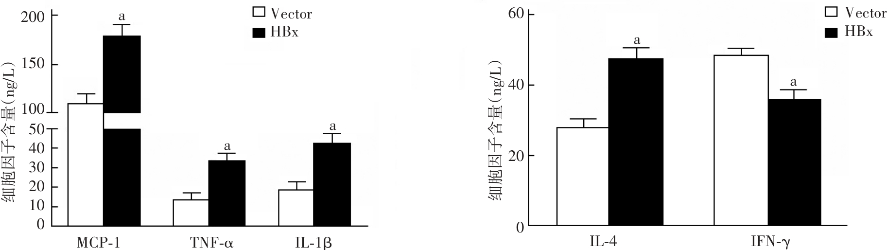 Vector:转染空载体组;HBx:转染HBx质粒组;MCP?1:单核细胞趋化蛋白1;TNF?α:肿瘤坏死因子α;IL:白细胞介素;IFN?γ:干扰素γ;与Vector组相比,